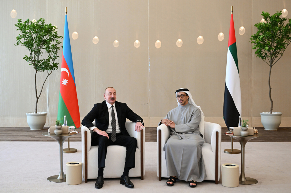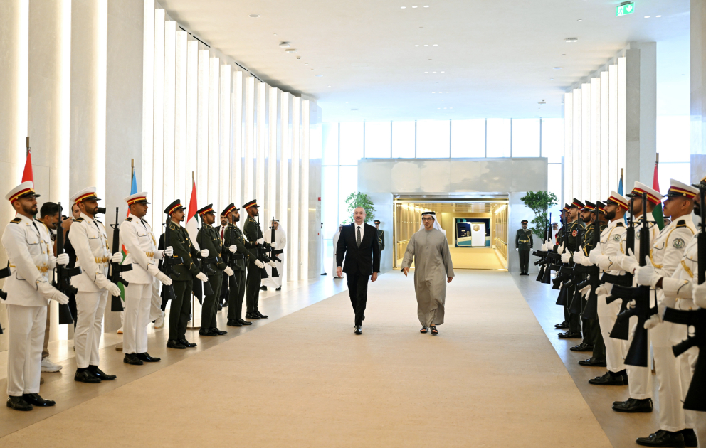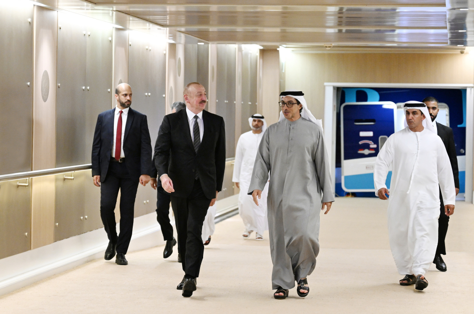 Президента Ильхама Алиева встречали вице-президент, заместитель премьер-министра, руководитель Президентского совета (Дивана) Объединенных Арабских Эмиратов шейх Мансур бен Заид Аль Нахайян и другие официальные лица.