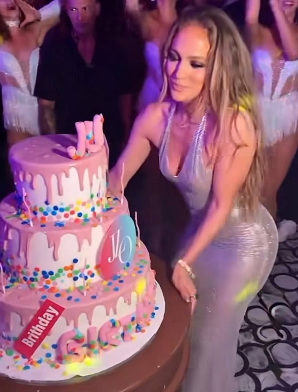 Специально для Лопес местные кондитеры изготовили шикарный трёхъярусный торт. Для появления перед гостями 56-летняя именинница выбрала облегающее платье серебристого цвета с декольте и открытой спиной. Дженнифер задула свечи, танцуя под свою же песню.
