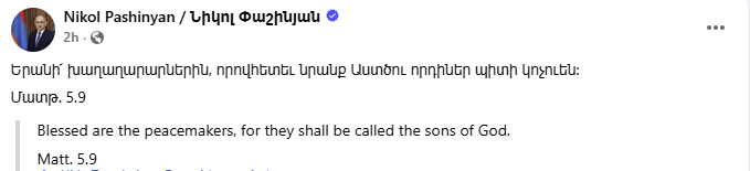 Находящийся в Вашингтоне премьер-министр Армении Никол Пашинян поделился цитатой из Библии на своей странице в Facebook.