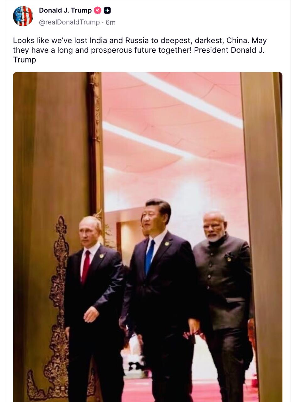 Дональд Трамп опубликовал совместное фото Си Цзиньпина, Владимира Путина и Нарендры Моди, заявив, что США "потеряли" Россию и Индию.