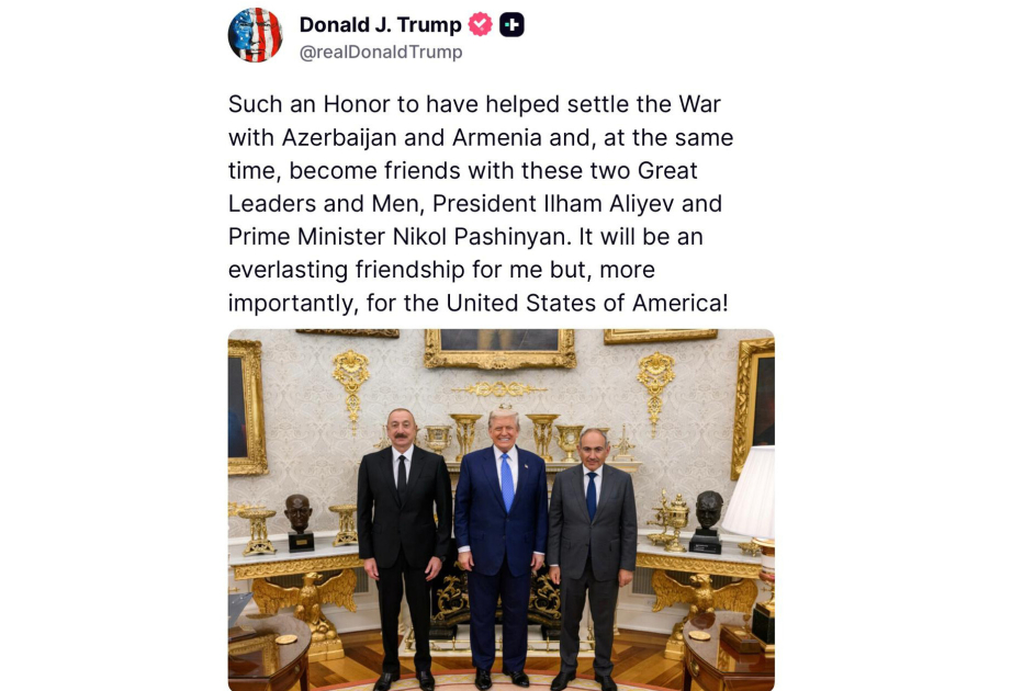 “Для меня большая честь помочь урегулировать войну между Азербайджаном и Арменией и одновременно стать друзьями с этими двумя выдающимися лидерами и людьми - Президентом Ильхамом Алиевым и Премьер-министром Николом Пашиняном. Для меня это будет вечная дружба, а что еще важнее - для Соединенных Штатов Америки!” - написал Трамп.