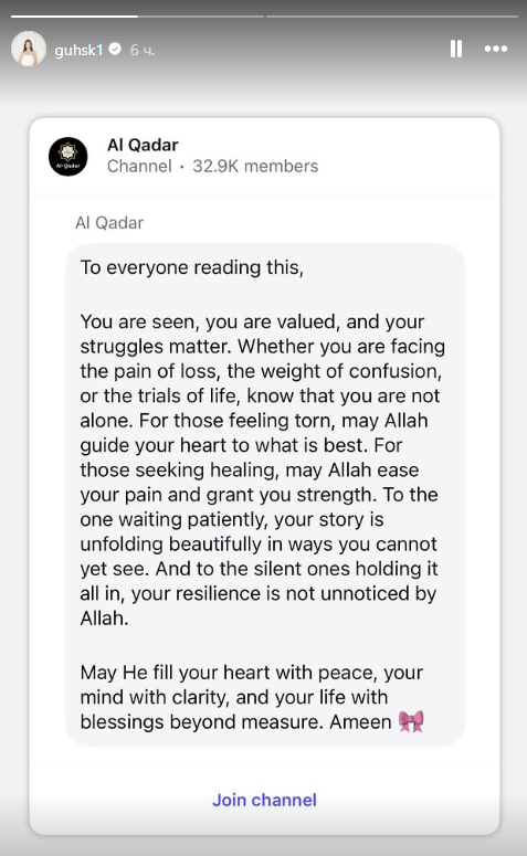 Далее, в разделе “истории” она поделилась одной из сур Корана и оставила запись, заканчивающуюся строками “Ваше терпение не останется незамеченным Всевышним”.