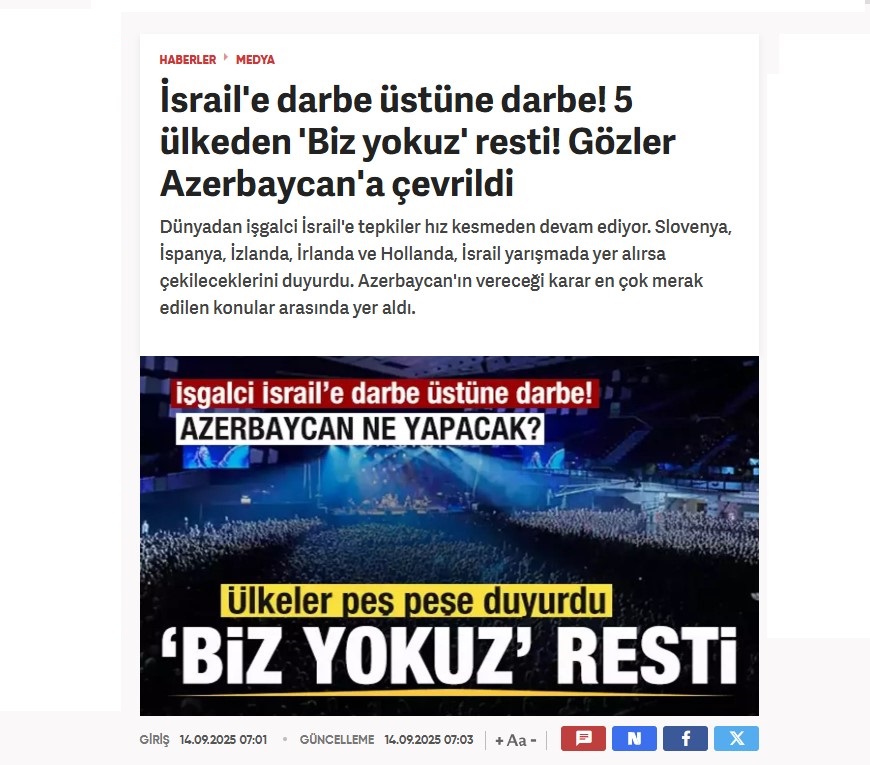 Почему турецкие СМИ вдруг стали терять свой авторитет в Азербайджане остаётся непонятным. Все медиаструктуры, освещавшие мероприятие ООН, подтвердили, что во время выступления Нетаньяху азербайджанская делегация отсутствовала в зале. То же касается фейков, связанных с «Евровидением».