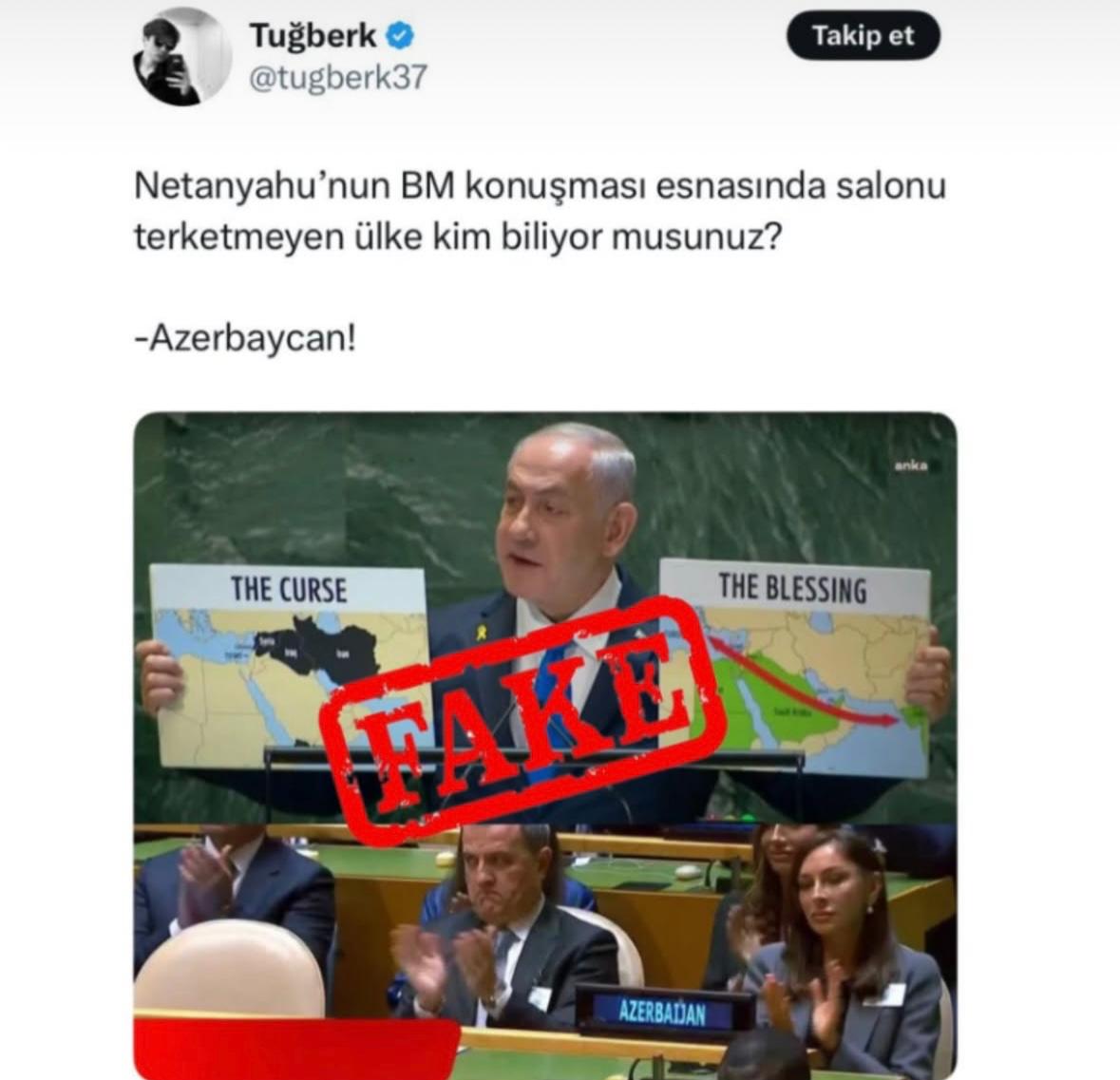 Удивительно и то, что в турецких СМИ исказили событие, которое происходило на глазах всего мира — заседание ООН. В некоторых сегментах турецких СМИ и соцсетей распространилась ложная информация и фейковое фото о том, что якобы азербайджанская делегация находилась в зале во время выступления премьер-министра Израиля Биньямина Нетаньяху, которое было бойкотировано рядом стран. Заседания ООН транслируются в прямом эфире и доступны на официальном сайте ООН, их может посмотреть любой желающий. Кроме того, на сессии ООН участвовали представители всех мировых СМИ, а не только Турции. Азербайджан также был представлен большой делегацией журналистов. Ведущие агентства и телеканалы Азербайджана освещали визит Президента из Нью-Йорка. Как можно создавать и распространять фейковые новости на столь открытом и публичном мероприятии, проходящем на глазах у всех? Ведь все видели, что во время выступления Нетаньяху азербайджанская делегация отсутствовала в зале. Что дает турецким СМИ фотомонтаж и распространение поддельных фото и новостей?