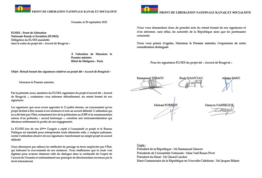 Уполномоченные представители, подписавшие Бужевальское соглашение от имени Канакского социалистического фронта национального освобождения (FLNKS), направили письмо президенту Франции, премьер-министру, председателям Национального собрания и Сената, а также префекту этой страны в Канакии (Новой Каледонии).