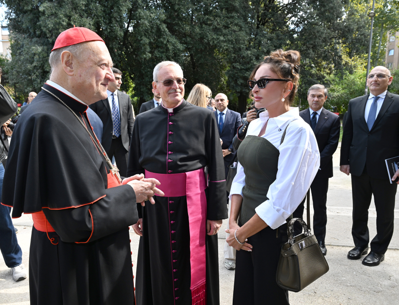 Первого вице-президента Мехрибан Алиеву встретили президент Папской комиссии по священной археологии монсеньор Паскуале Якобоне, бывший президент Папской комиссии по культуре и священной археологии кардинал Джанфранко Равази и президент VIII округа города Рим Амедео Чаккери.