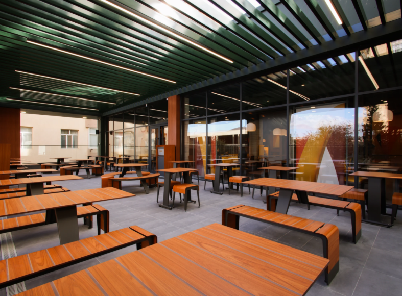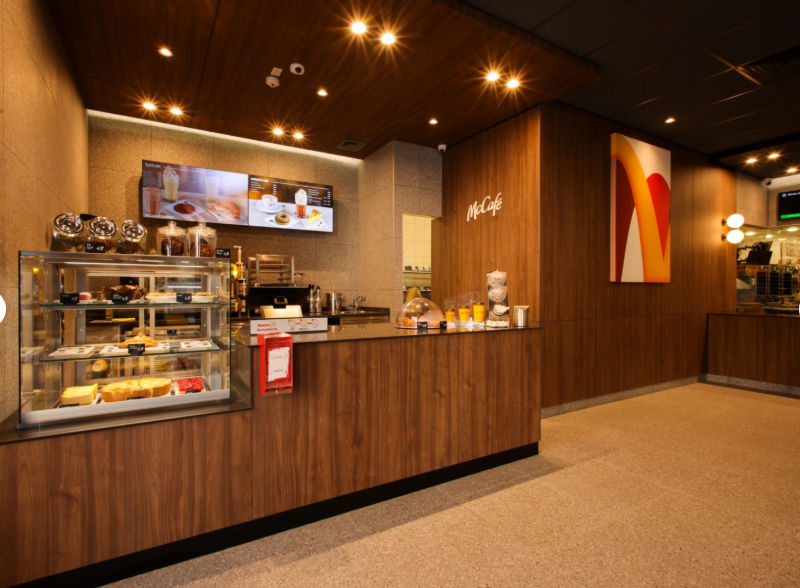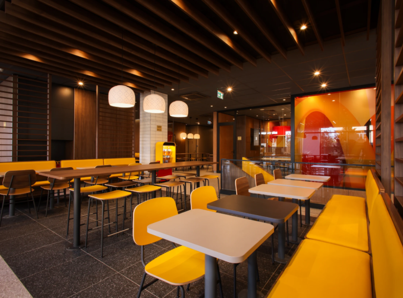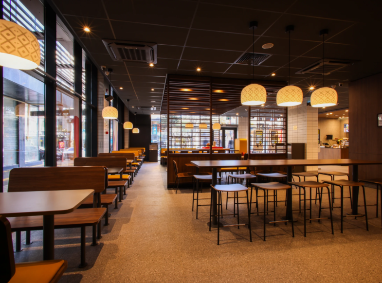 Ресторан представляет собой отдельное здание с зоной МакАвто, что позволяет гостям получать свои заказы ещё быстрее и удобнее. Интерьер оформлен в концепции A Touch of Archery, где мягкие линии сочетаются с динамичными акцентами, создавая лёгкую и уютную атмосферу.