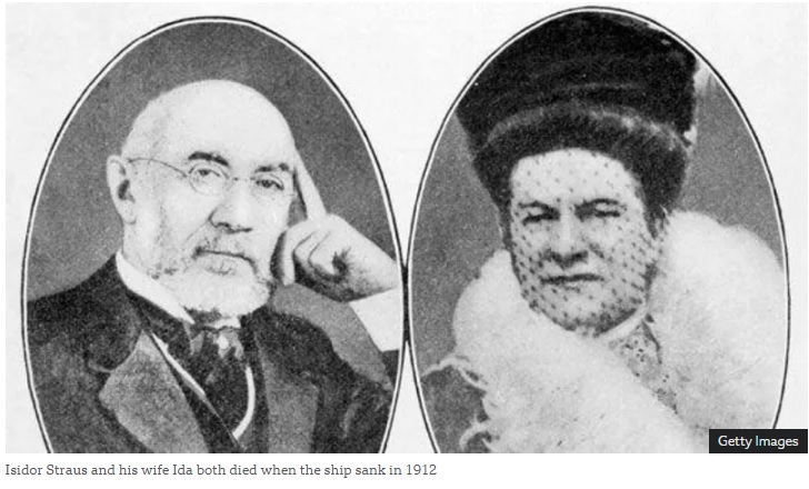 Золотые карманные часы фирмы Jules Jurgensen принадлежали германо-американскому предпринимателю Исидору Штраусу, совладельцу крупнейшей американской сети универмагов Macy's. Он путешествовал на лайнере со своей супругой Идой.