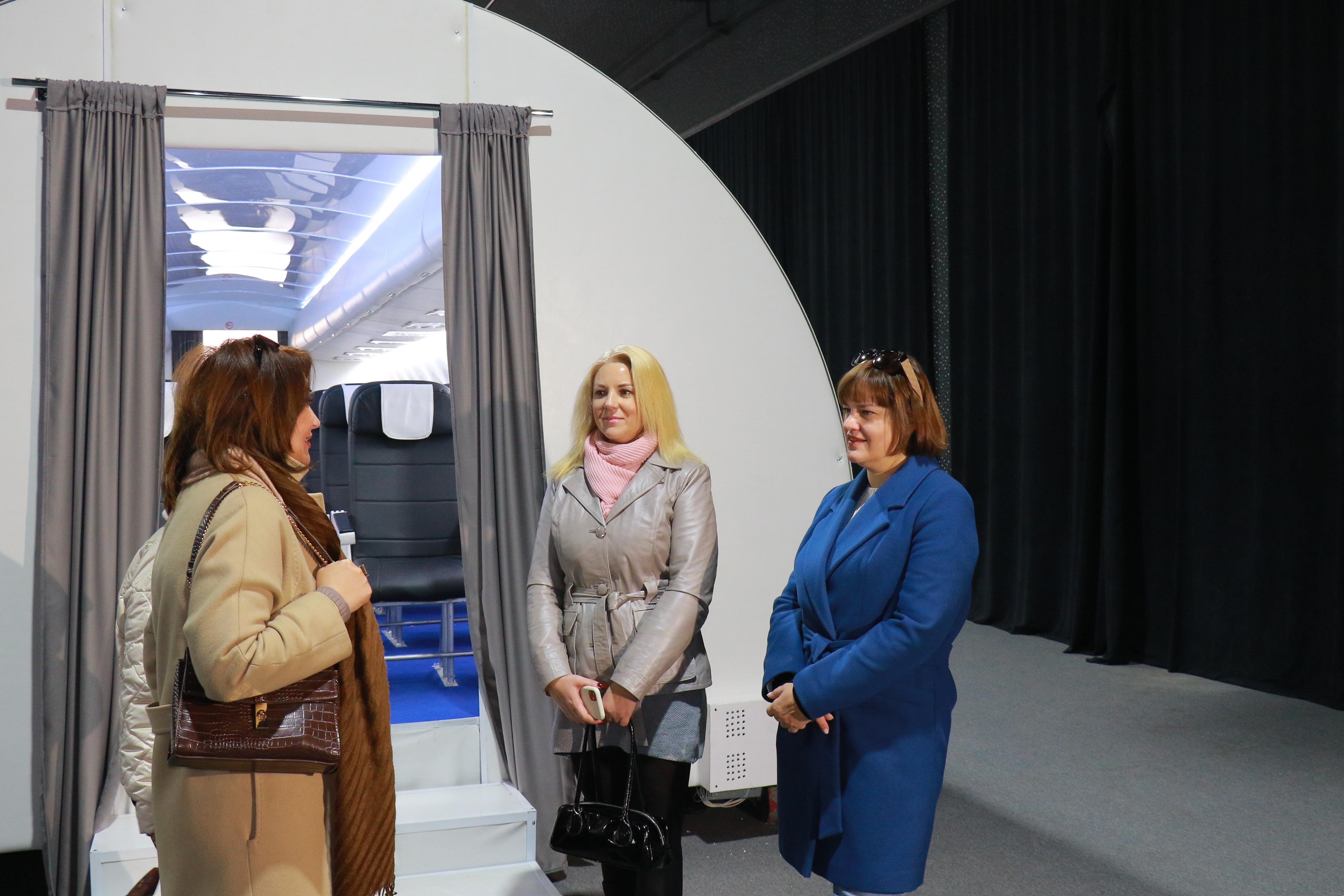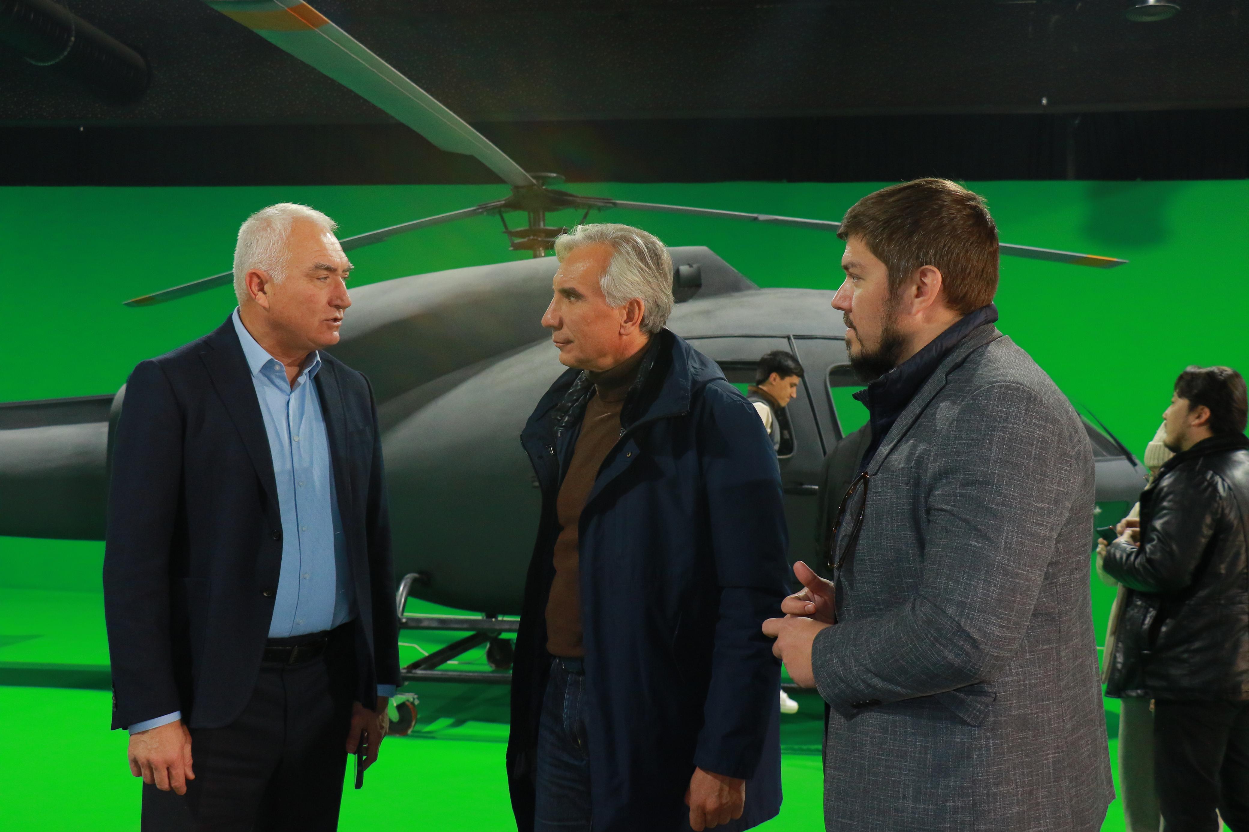 Участники осмотрели установленные в павильоне декорации: самолет, вертолет, тюрьму, научную лабораторию и трехсторонние конструкции на зеленом экране.