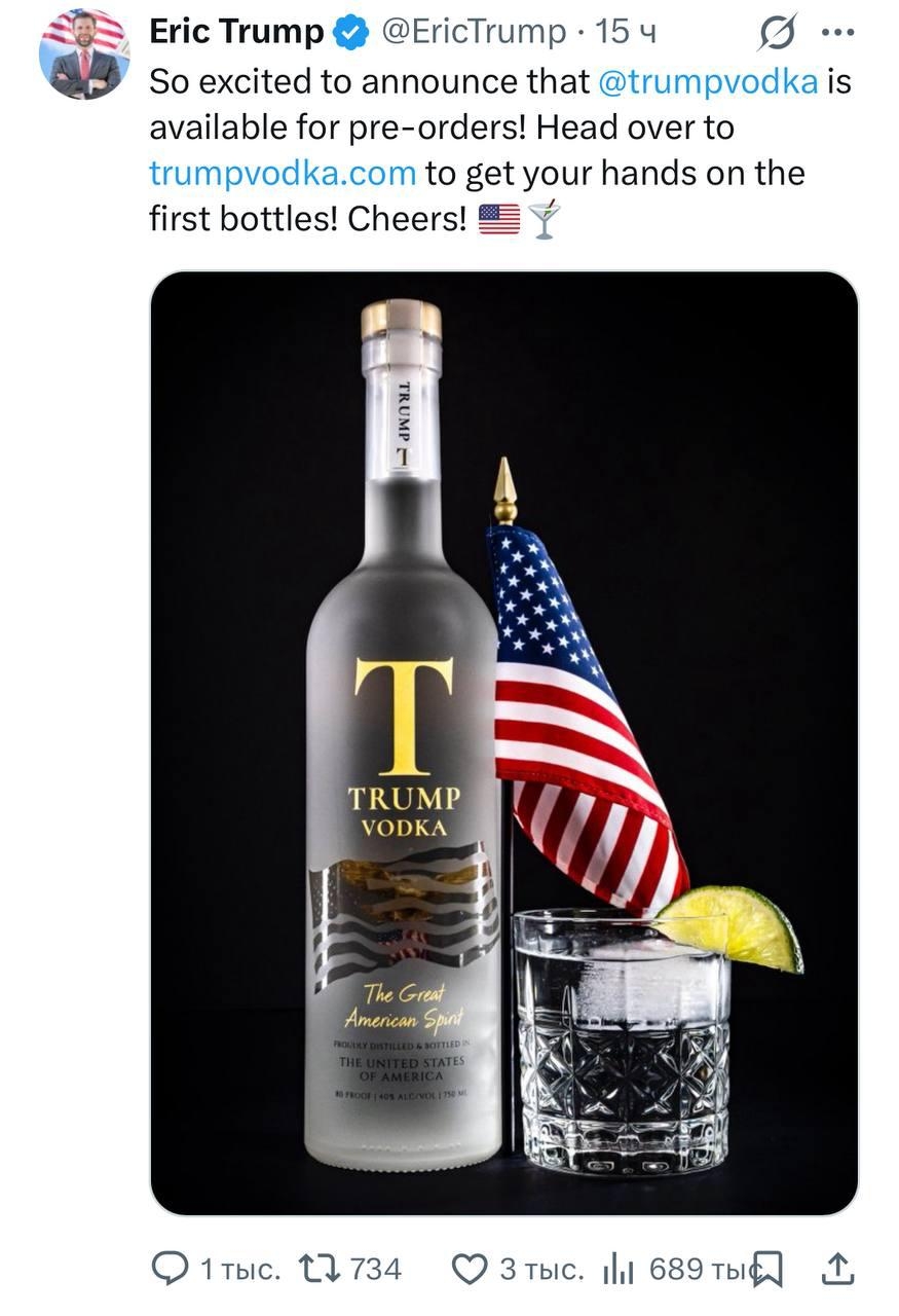 “Рад сообщить, что Trump-vodka доступна для предварительных заказов!” - написал в посте Эрик, уточнив, что заказать алкоголь можно будет на отдельном сайте.