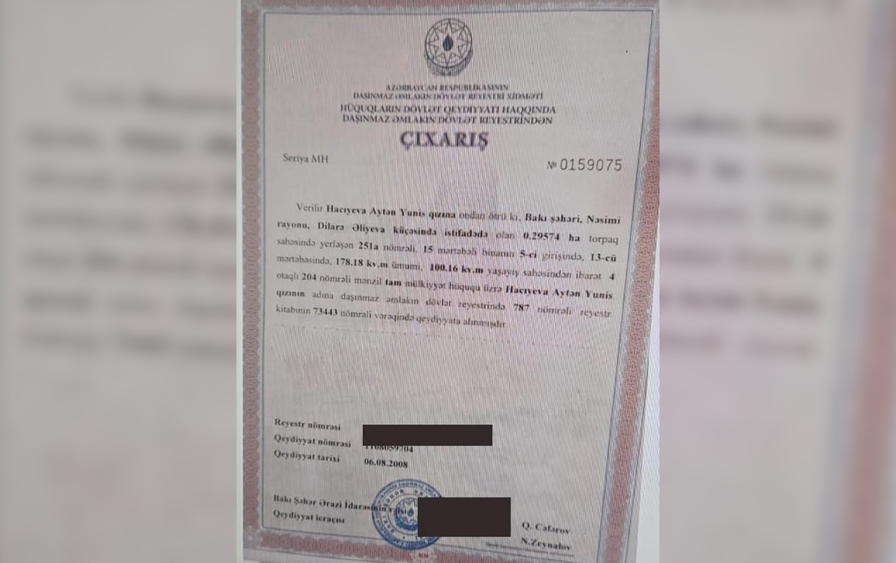 Одна из этих квартир записана на имя отца Гюльтекин Гаджибейли — Юниса Гаджиева. Речь идет о квартире №183 площадью 179,4 кв. м, расположенной по тому же адресу. Г. Гаджибейли в настоящее время сдает эту квартиру за крупную сумму.