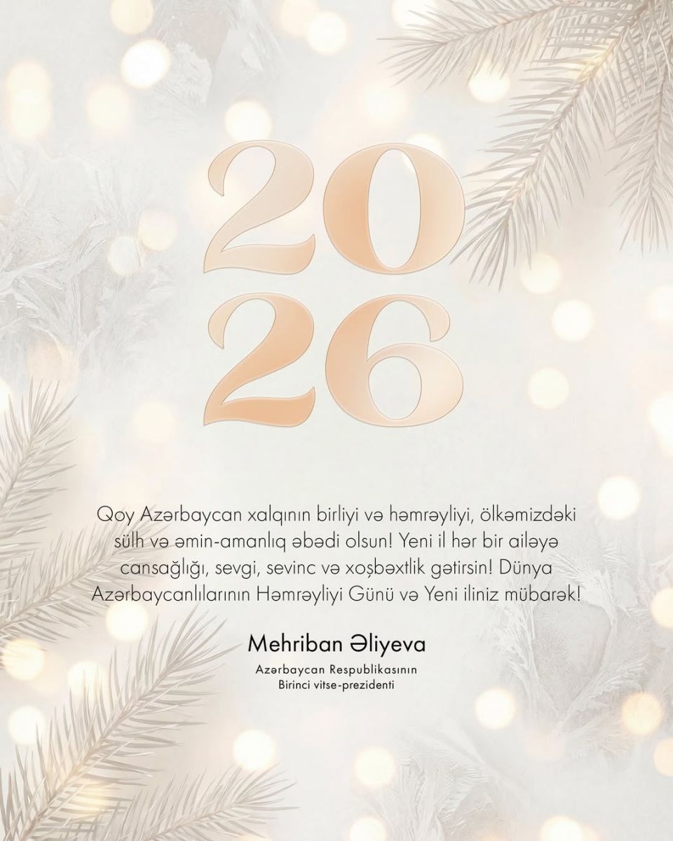 Первый вице-президент Азербайджанской Республики Мехрибан Алиева поделилась на своей официальной странице в Instagram публикацией в связи с 31 Декабря - Днем солидарности азербайджанцев мира и Новым годом.