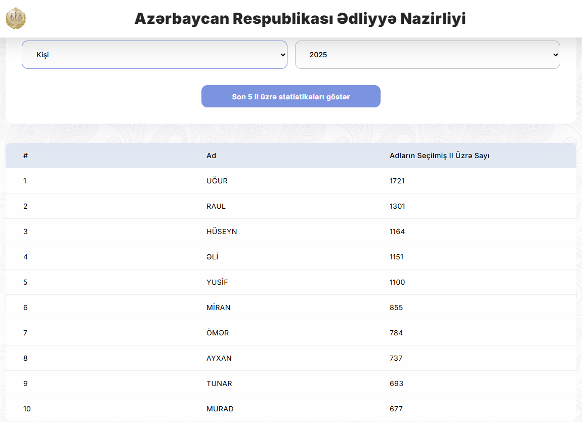 Самым популярным мужским именем в 2025 году стало имя Угур. Оно было дано 1 721 ребенку. Далее следуют: Рауль (1 301), Гусейн (1 164), Али (1 151), Юсиф (1 100), Миран (855), Омар (784), Айхан (737), Тунар (693) и Мурад (677).