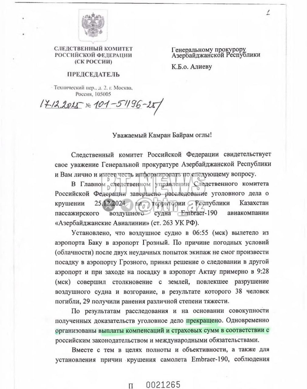 Как передает "Qafqazinfo" со ссылкой на вышеуказанный Telegram-канал, согласно его содержанию, документ исходит от Следственного комитета РФ и адресован Генеральной прокуратуре Азербайджана. В нем утверждается, что самолет AZAL якобы не смог совершить посадку на территории России из-за неблагоприятных погодных условий, а затем при посадке произошло столкновение с землей. На этом основании уголовное дело было прекращено.
