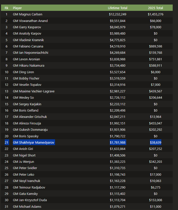 Т.Раджабов, находящийся на 28-м месте, в общей сложности заработал 1 117 290 долларов (1 900 000 AZN), в 2025 году - 6 275 долларов (10 667,50 AZN).