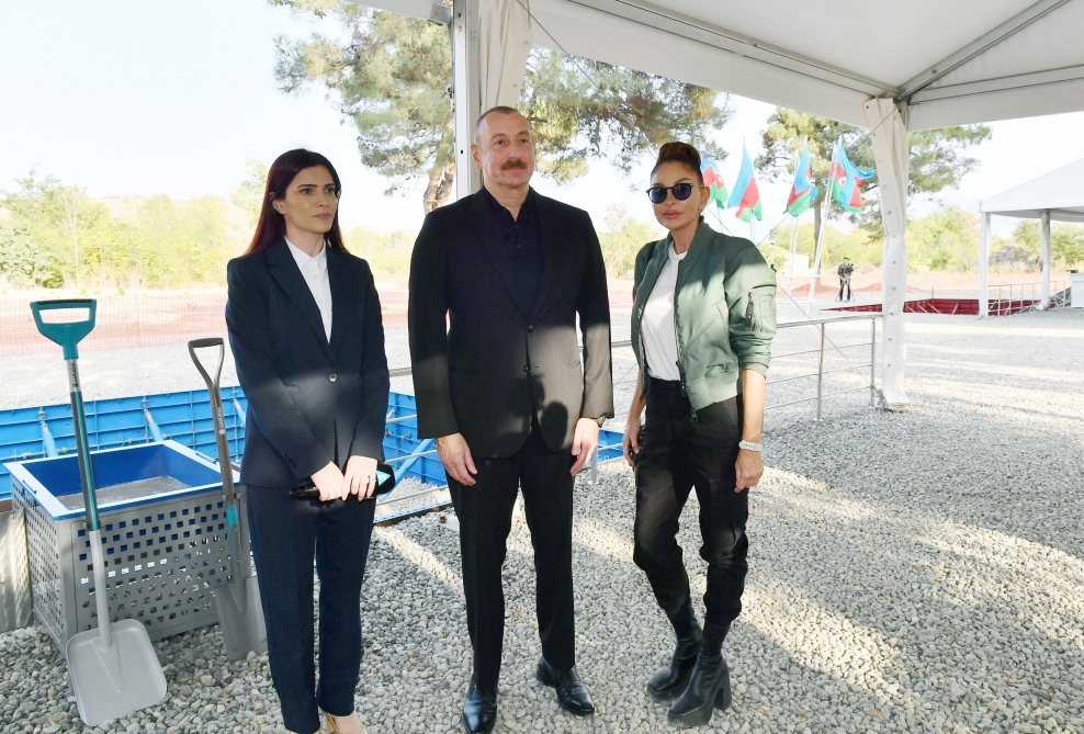 Президент Азербайджана Ильхам Алиев и первая леди Мехрибан Алиева 19 октября приняли участие в церемонии закладки фундамента первого жилого здания и школы в городе Зангилан.