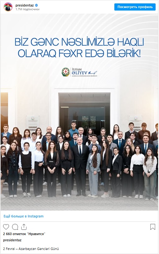 Президент Азербайджана Ильхам Алиев поделился в своих аккаунтах в социальных сетях публикацией по случаю 2 Февраля - Дня молодежи Азербайджана.