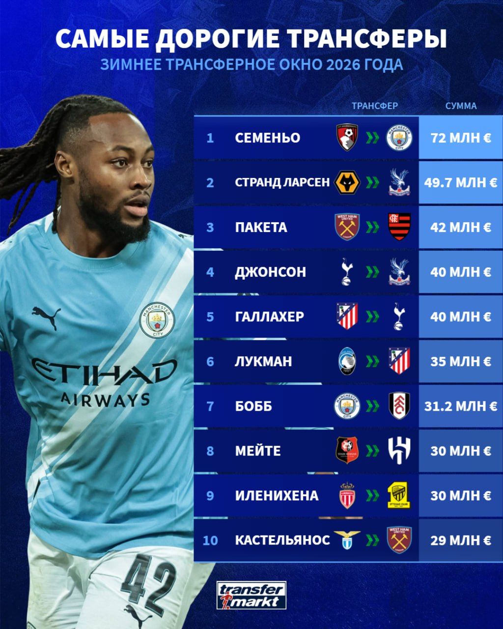 Статистический портал Transfermarkt опубликовал десятку самых дорогих трансферов, свершившихся в последний день зимнего окна.