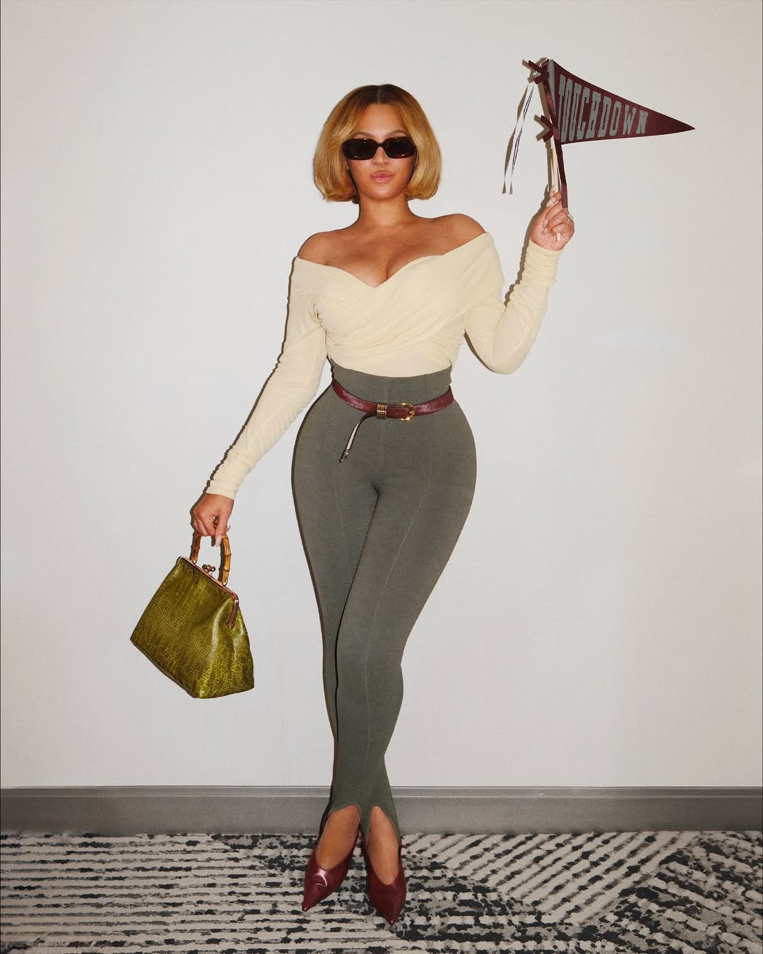 44-летняя певица позировала в желтом боди с глубоким декольте и зеленых облегающих брюках. Образ дополнили солнцезащитные очки, кожаный ремень, туфли на высоких каблуках, с острым мысом и зеленая сумка с деревянной ручкой. Волосы Бейонсе подстригла в боб-каре и перекрасилась в теплый блонд.