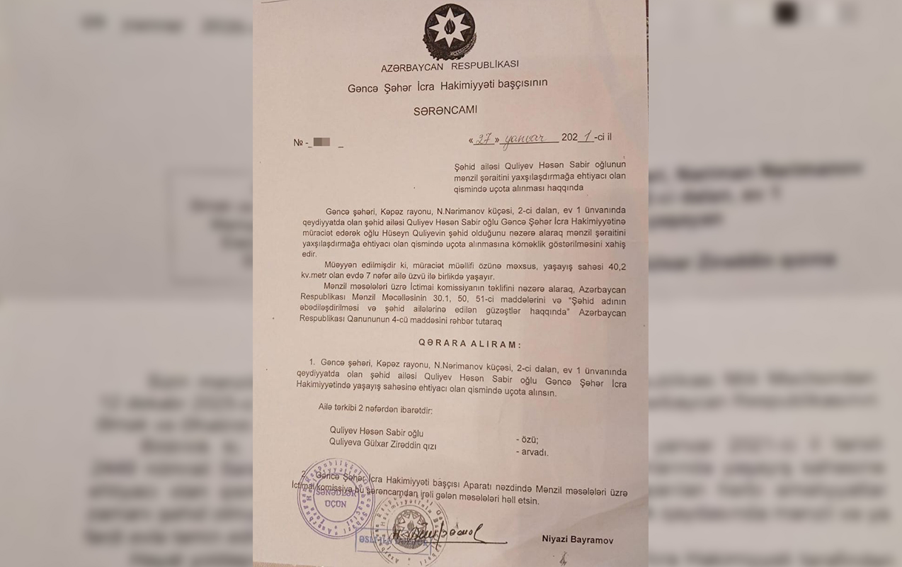 По словам матери, еще 27 января 2021 года распоряжением №8 Исполнительной власти (ИВ) города Гянджа отец шехида, Гасан Сабир оглы Гулиев, был официально взят на учет как лицо, нуждающееся в улучшении жилищных условий.