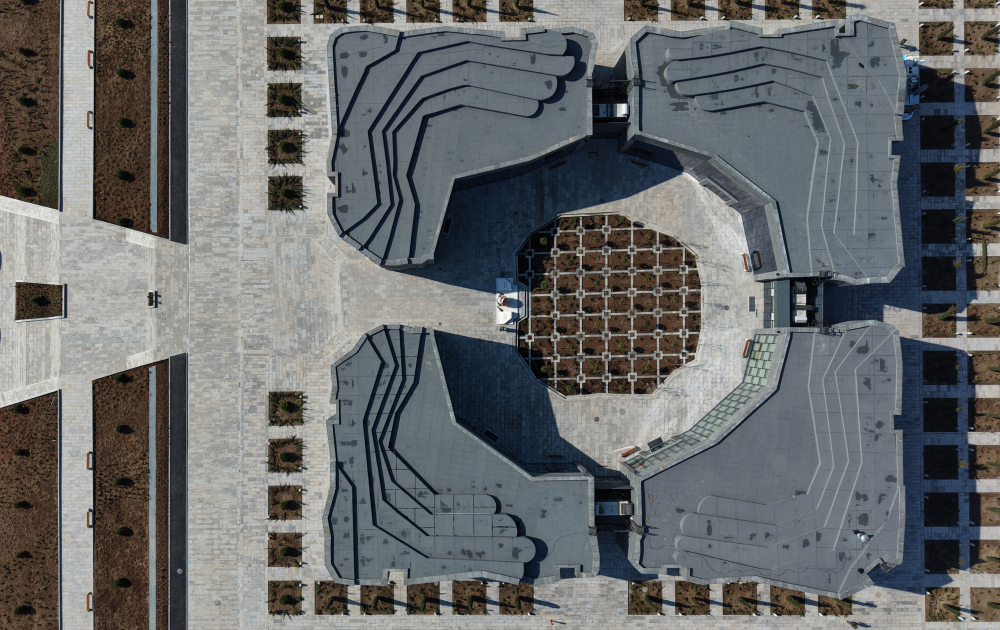 Монолит, окружающий мемориал с четырех сторон, выполнен в форме символических рук, пытающихся защитить жителей Ходжалы от геноцида.