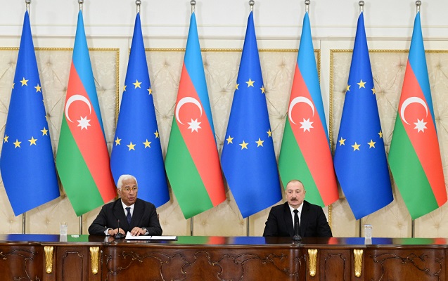 Президент Азербайджанской Республики Ильхам Алиев и президент Совета Европейского Союза Антониу Кошта выступают с заявлениями для прессы.