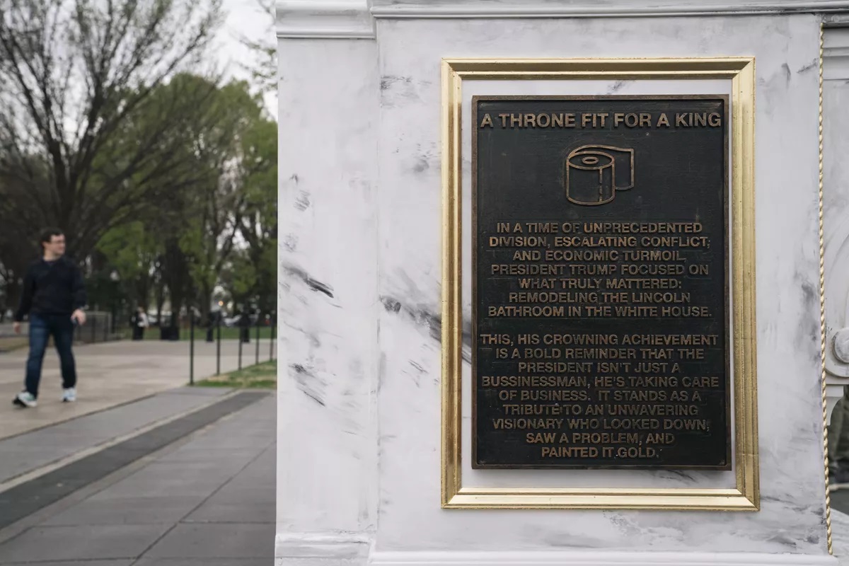 На инсталляции установлена табличка, из которой следует, что она получила название "Трон для короля". На ней написано, что "во времена беспрецедентного внутриполитического раскола, разрастающегося конфликта и экономических неурядиц, президент Трамп сосредоточился на том, что действительно важно - реновации ванной Линкольна в Белом доме".