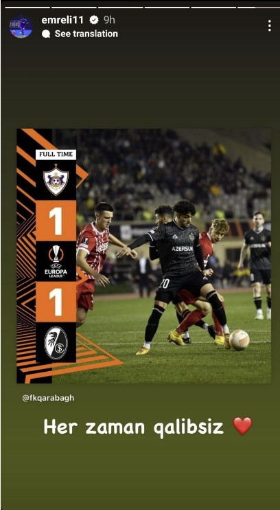 Как сообщает "Qafqazinfo", 25-летний форвард поделился результатом матча после того, как агдамская команда сыграла вничью 1:1 с "Фрайбургом" в последнем туре группового этапа Лиги Европы и добавил подпись " Вы всегда победители".