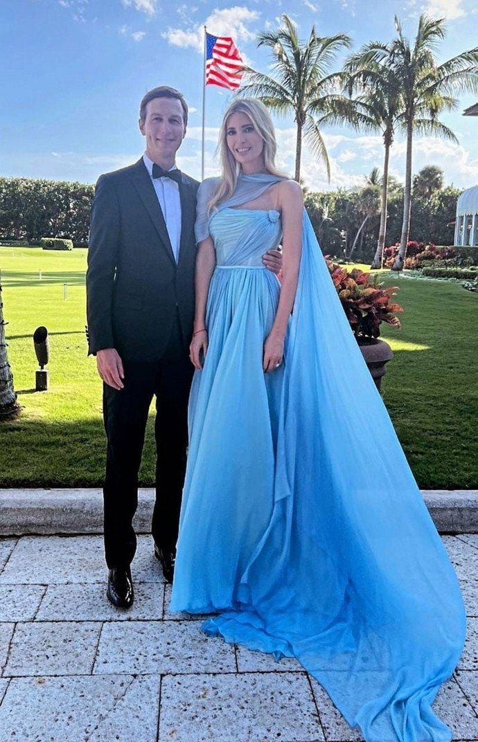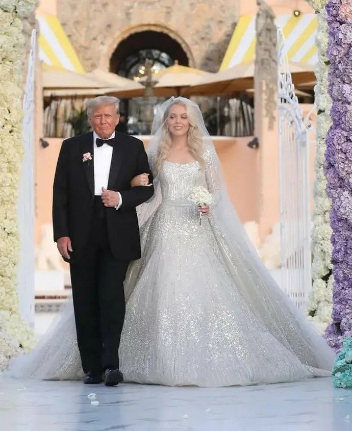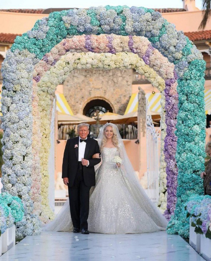 Невеста, её мать - бывшая жена Трампа, Марла Мейплз и подружка невесты Иванка Трамп были одеты в платья ливанского дизайнера Elie Saab.