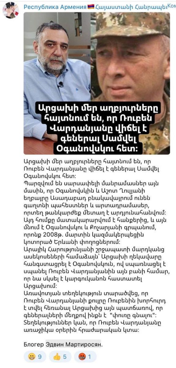 «Вчера распространилась информация о том, что сестра Рубена Варданяна посоветовала ему срочно покинуть Карабах, дабы не стать жертвой Огановского и Кочаряна. Есть сведения, что Рубен Варданян в ближайшие дни может подать в отставку», - написал Мартиросян.