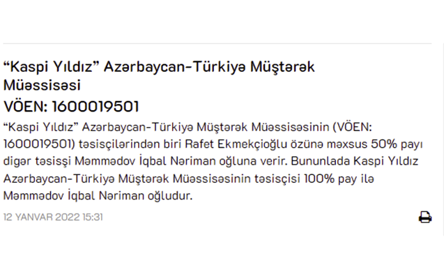 По другой информации, один из учредителей компании с 50% акций является Рафет Экмекчиоглу, а другим учредителем является Мамедов Игбал Нариман оглы. Так, Мамедов Игбал Нариман оглы стал учредителем азербайджано-турецкого совместного предприятия “Kaspi Yildiz” со 100-процентной долей участия.