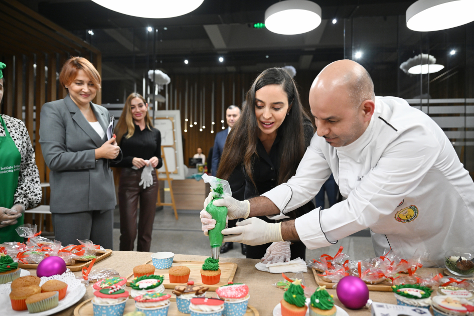 Лейла Алиева и Арзу Алиева ознакомились с ручными работами детей из уязвимых групп, проходящих в центре обучение по кулинарии. Дети представили приготовленные ими сладости на тему ”Новый год”.
