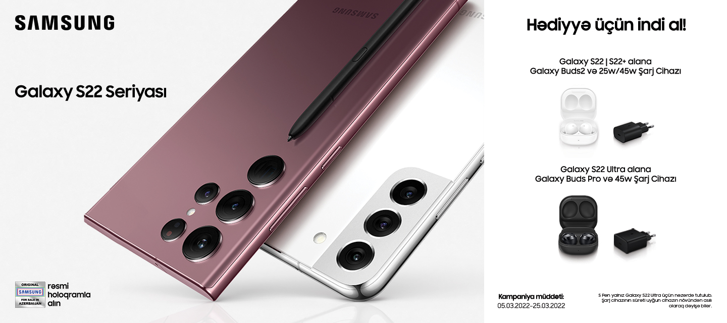 Девайсы уже доступны к продаже в Азербайджане. В рамках специальной кампании при покупке Galaxy S22/ Galaxy S22+ в подарок вы получаете Galaxy Buds2 и зарядное устройство на 25w/45w ( в зависимости от комплектации). А при покупке Galaxy S22 Ultra в подарок вы получаете Galaxy Buds Pro и зарядное устройство на 45w. Отметим, что кампания будет в силе с 05.03.2022-25.03.2022.