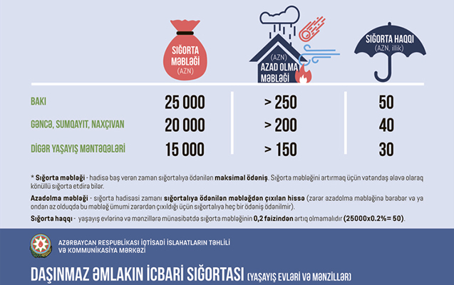 Hazırda yaşayış evləri və mənzillər Bakı şəhəri üzrə 25000 manat sığorta məbləği olmaqla sığorta haqqı 50 manat, Gəncə, Sumqayıt və Naxçıvan şəhərlərində 20000 manat sığorta məbləği olmaqla sığorta haqqı 40 manat, digər şəhər və rayonlarda 15000 manat sığorta məbləği olmaqla sığorta haqqı 30 manat təşkil edir”.