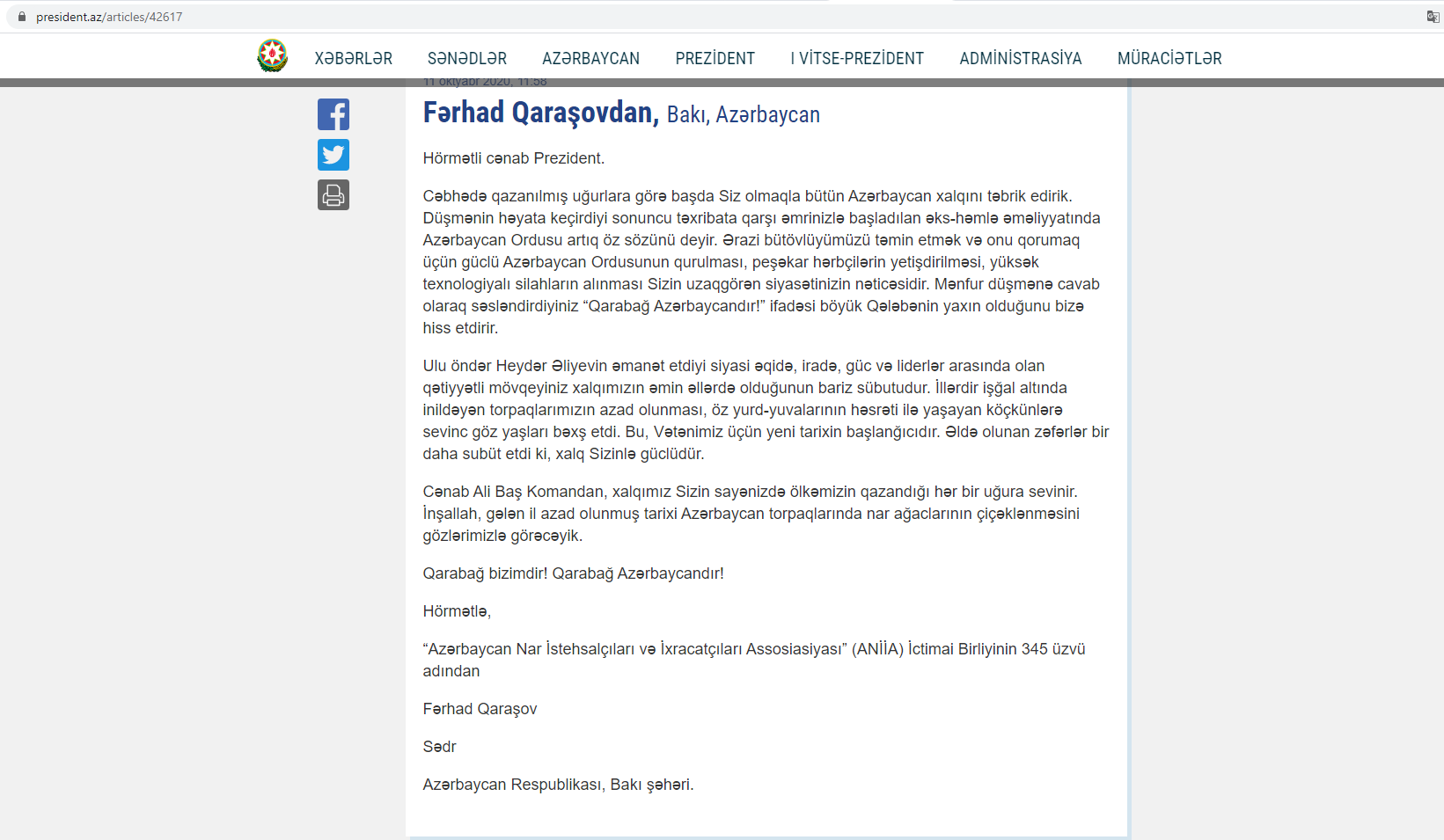 Cəbhədə qazanılmış uğurlara görə başda Siz olmaqla bütün Azərbaycan xalqını təbrik edirik. Düşmənin həyata keçirdiyi sonuncu təxribata qarşı əmrinizlə başladılan əks-həmlə əməliyyatında Azərbaycan Ordusu artıq öz sözünü deyir. Ərazi bütövlüyümüzü təmin etmək və onu qorumaq üçün güclü Azərbaycan Ordusunun qurulması, peşəkar hərbçilərin yetişdirilməsi, yüksək texnologiyalı silahların alınması Sizin uzaqgörən siyasətinizin nəticəsidir. Mənfur düşmənə cavab olaraq səsləndirdiyiniz “Qarabağ Azərbaycandır!” ifadəsi böyük Qələbənin yaxın olduğunu bizə hiss etdirir.