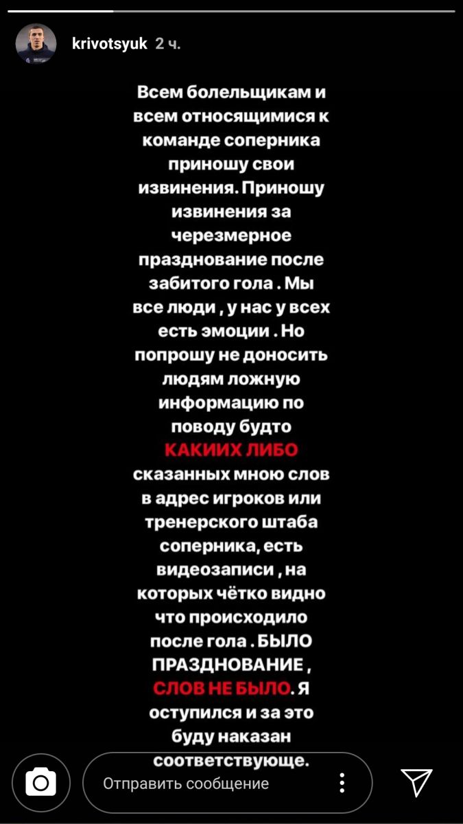 “Neftçi”nin futbolçusu Anton Krivotsyuk Premyer Liqanın III turunda “Sumqayıt”la matçın sonlarında iştirak etdiyi insidentdə hərəkətinə görə üzr istəyib. “Qafqazinfo” xəbər verir ki, millimizin də üzvü olan gənc müdafiəçi bununla bağlı “İnstagram” hesabında paylaşım edib: