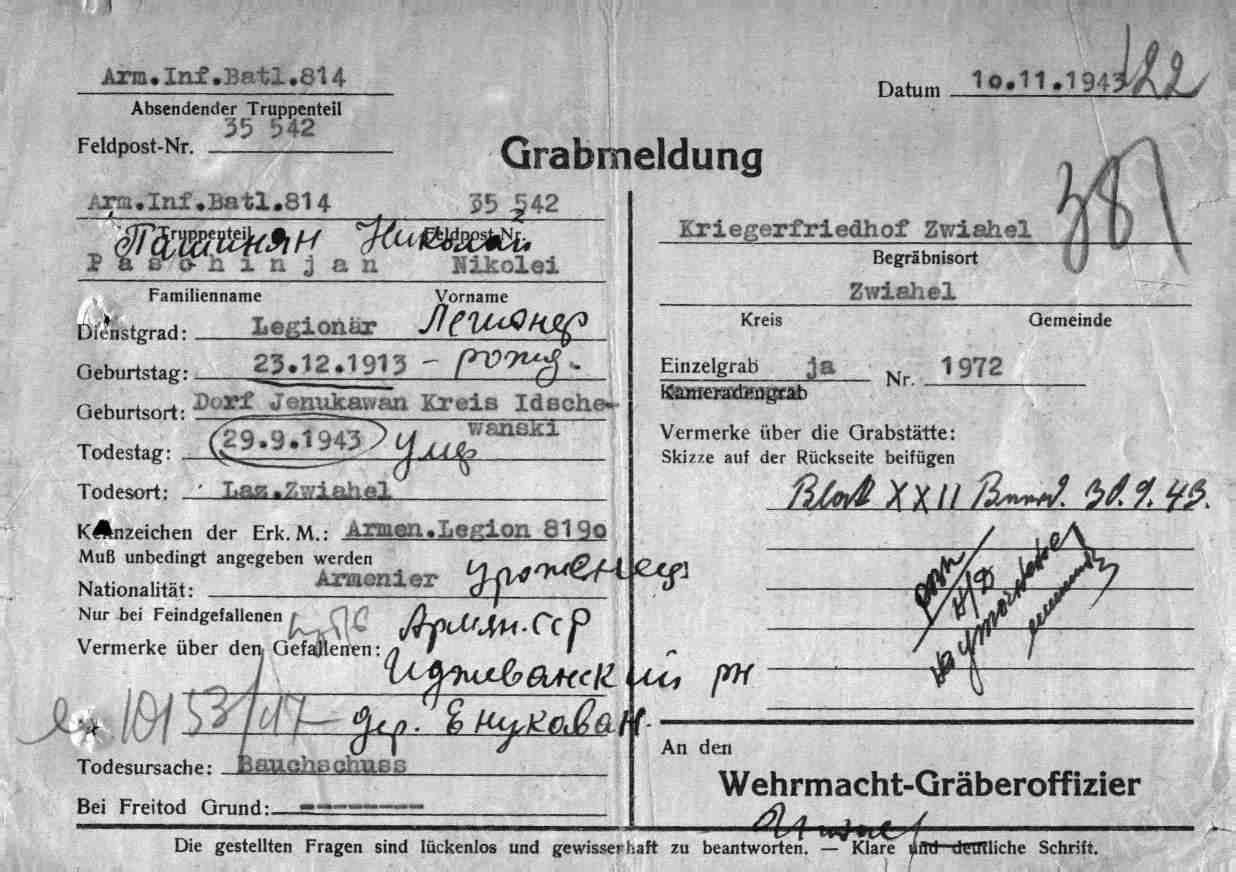 Baba Paşinyanın satqınlığının təsdiqi qismində onun SS ost-legionerlərinə tabeliyini təsdiqləyən alman uçot sənədinin fotosu təqdim olunur.
