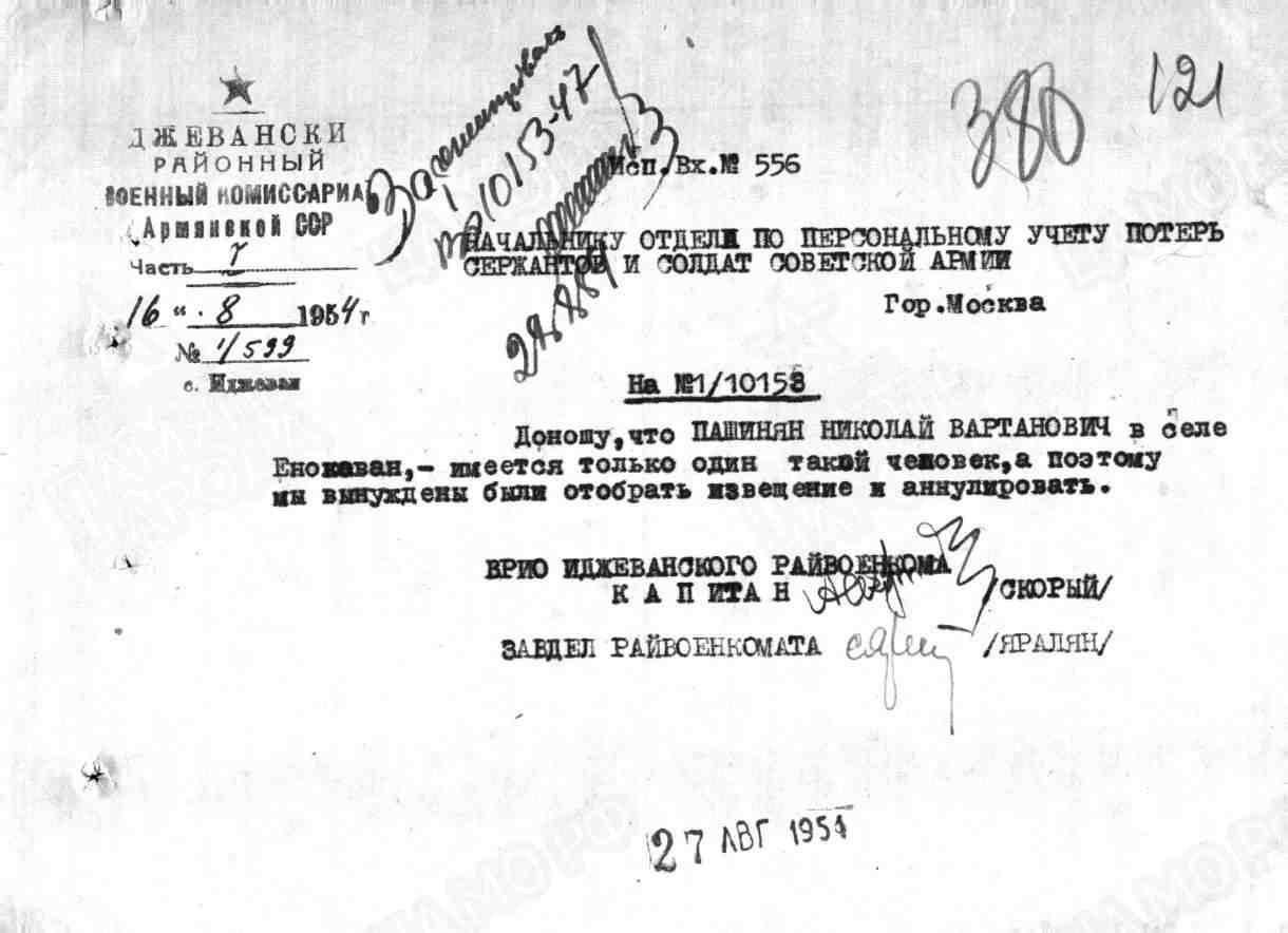 Aydın olub ki, Rusiya Müdafiə Nazirliyinin təşəbbüsü ilə yaradılmış “Memorial” məlumat bazasının saytında Böyük Vətən Müharibəsi dövründə həlak olmuş sovet vətəndaşları arasında 1913-cü ildə İcevan rayonu, Yenokovan kəndində anadan olmuş və 1943-cü ildə həlak olmuş Nikol Vartanoviç Paşinyan haqqında məlumatlar var.